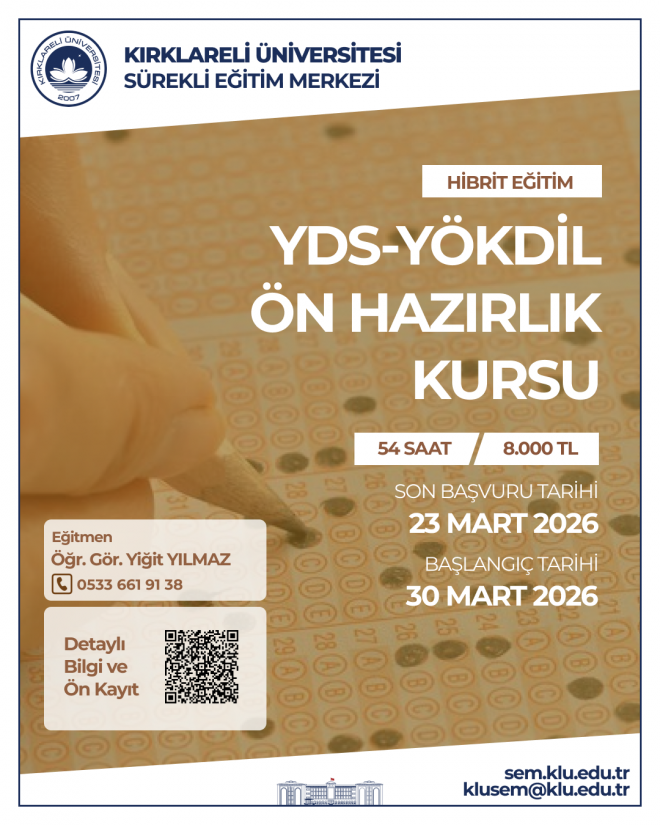 Kırklareli Üniversitesi Sürekli Eğitim Uygulama ve Araştırma Merkezi bünyesinde 30 Mart 2026 itibari ile YDS / YÖKDİL Ön Hazırlık Kursu açılması planlanmaktadır.