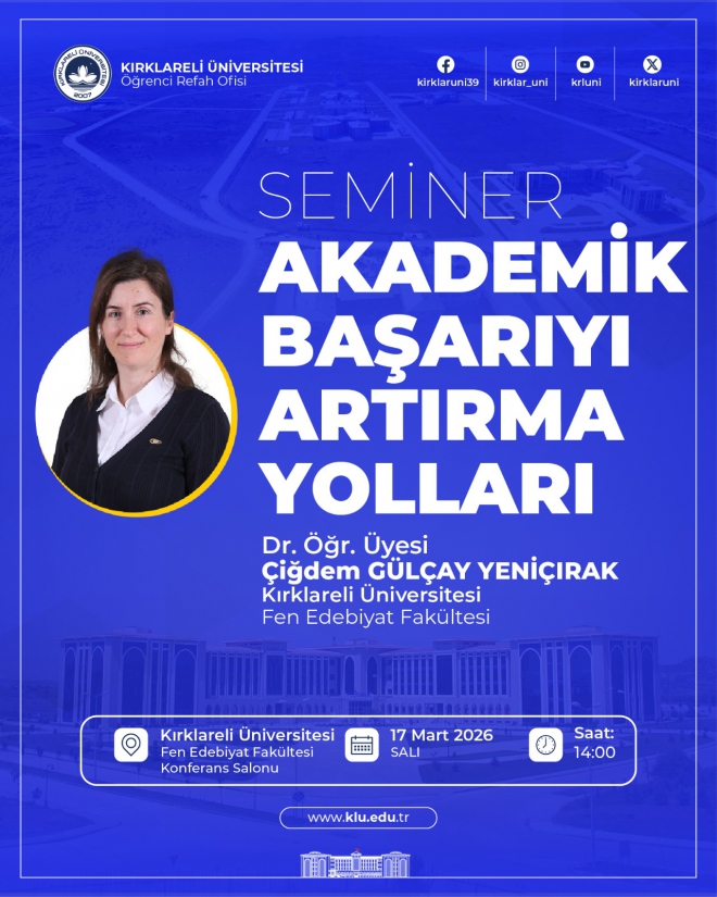 Üniversitemiz Öğrenci Refah Ofisi tarafından, “Akademik Başarıyı Artırma Yolları” konu başlıklı seminer düzenlenecektir.